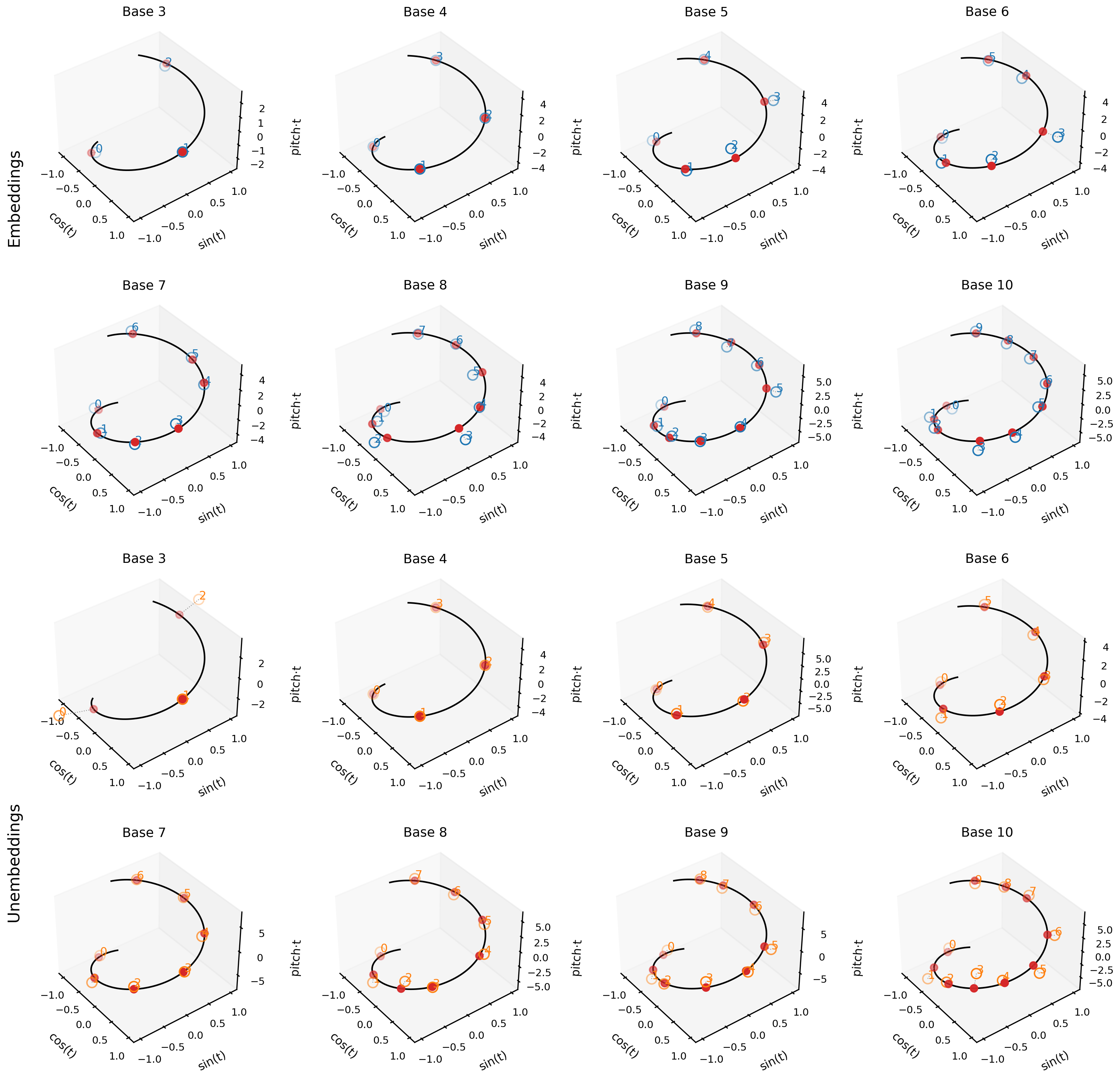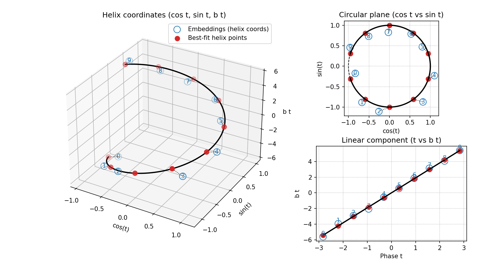 After training and fitting as described in Section 2 for bases 3 to 10, I evaluated the quality of the helical fits for the embeddings and unembeddings. First, isolating a representative example, the figure below shows the helix fit for the base 10 embeddings—note its high quality, with $\text{RMSE} = 0.214$ and $R^2 = 0.883$. The other helical fits are shown below; they are all visually convincing.