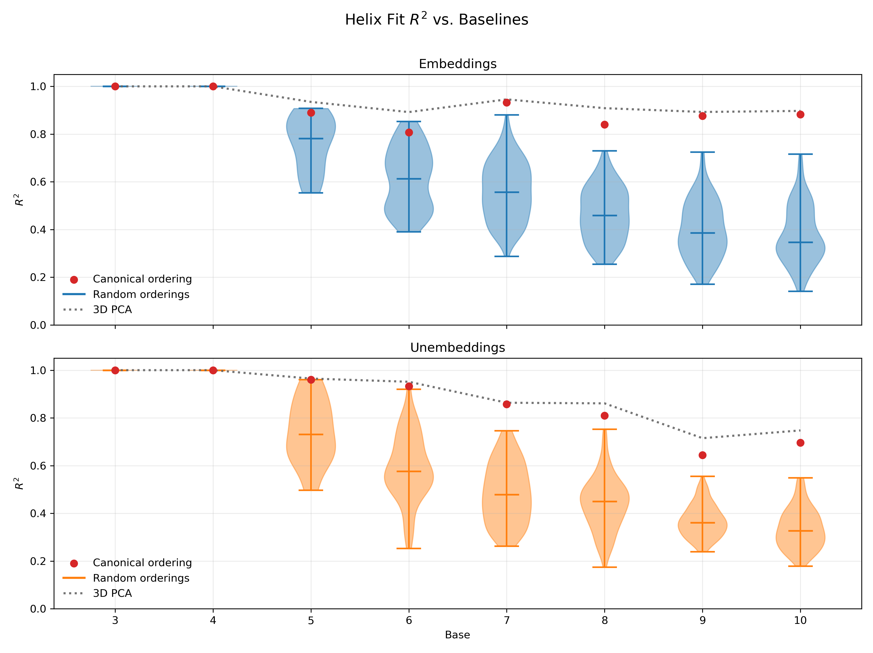 To quantitatively assess the quality of the helix fits, I compared to two baselines: (i) the first 3 principle components, which is a strong baseline given that the helix is a 1-dimensional manifold; and (ii) helix fits using random orderings (e.g., 0, 2, 1 for base 3), which probes the expressivity of the helix regardless of whether the ordering of digits along it is relevant to the network’s computation. Across most bases, the helix in the canonical ordering (i.e., the proper ordering with this carry function; see Section 4.2 for more detail) separates itself above the randomly-ordered helices, and in many cases approaches (or nearly matches) the 3D PCA baseline.